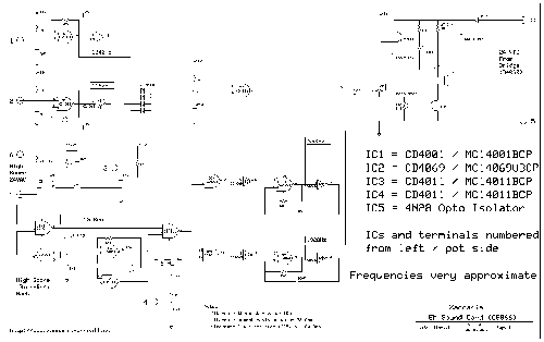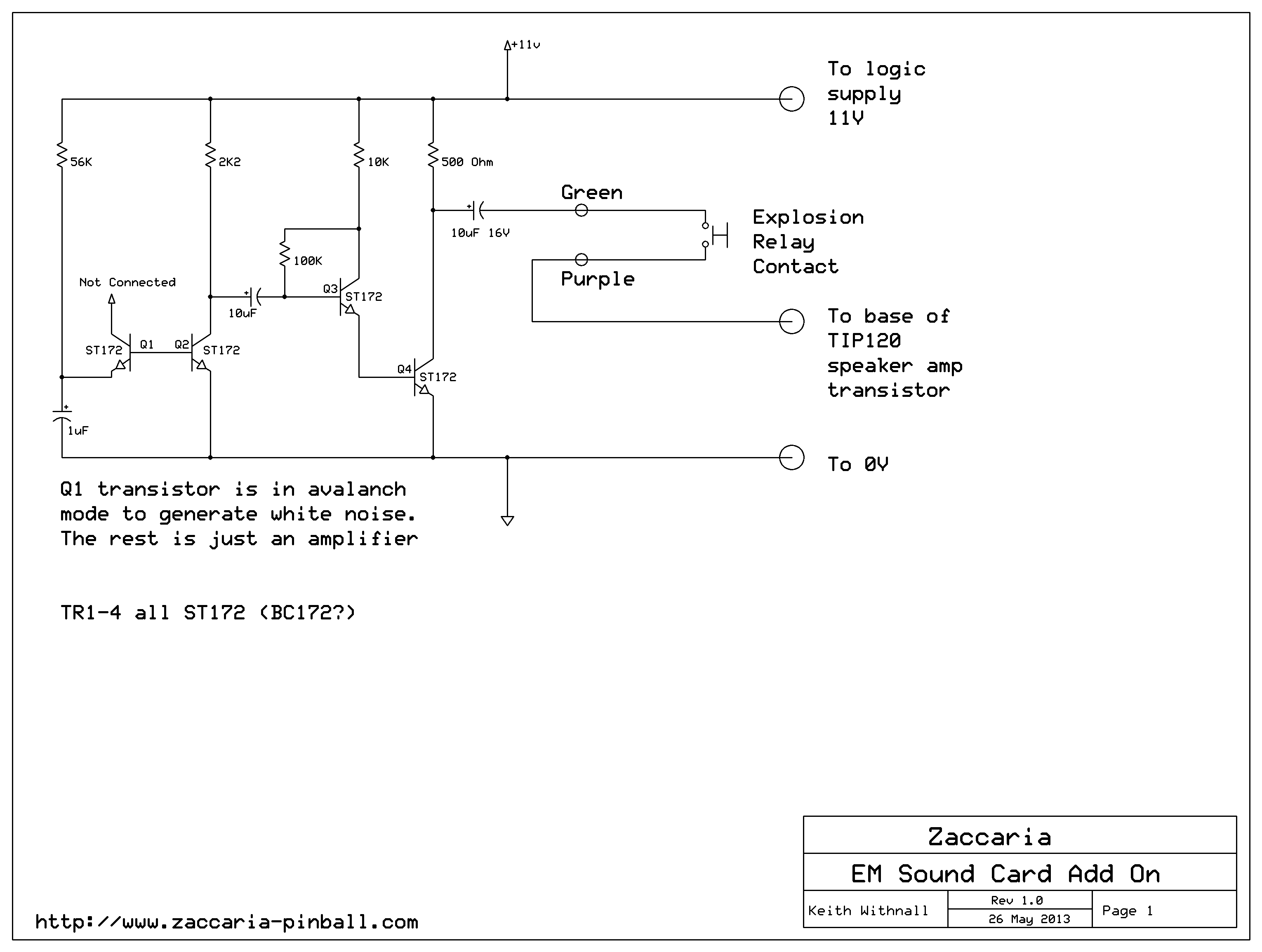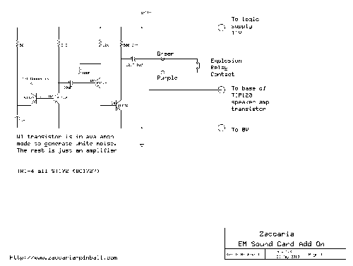 The second sheet shows the daughter-board which is tacked on the side of the sound card on Combat machines to make the 'explosion' sound. It is quite interesting as it uses TR1 with just the base-emitter connected in reverse so that it continuously breaks down (avalanches) to make white noise which is then amplified by the rest of the circuit. The circuit runs continuously and is switched by a relay contact to a connection patched onto the base of the TIP120 speaker amplifier of the sound card.