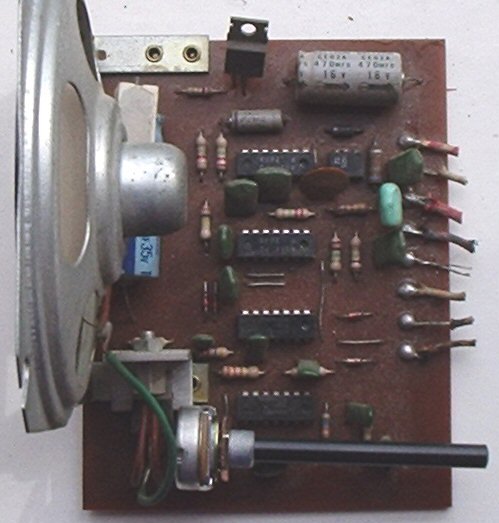 The sound card has a TIP29 transistor that regulates the 24V DC down to about 11V for the logic. There are 4 oscillators each made from a NOR gate and an inverter that provide the 4 score tones. These are OR'ed together through 4 IN4148 diodes, through a gate that prevents clicks during power up, and into a TIP120 power transistor that is protected by an NTC thermistor across base-emitter, bolted to the same heatsink. The wiring of the volume pot is a bit strange and looks like a tracking error on the board that should be from the wiper to one end, not between the two ends.