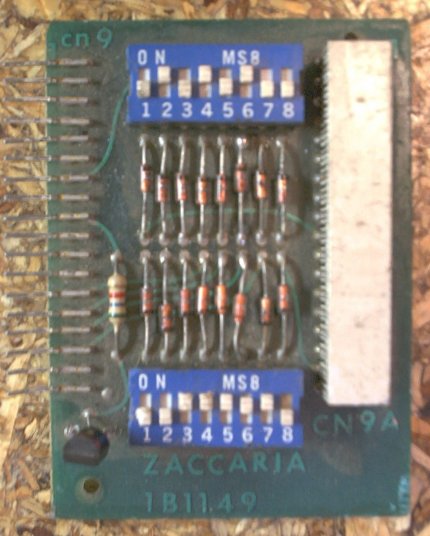 The 1B1149 is a small board that plugs in-line with the switch matrix connector (CN9) wiring and holds two sets of DIP switches and 16 diodes and is used to set default game settings for pricing and game play that the game can use if the settings stored in the 5101 CMOS RAM are found to be bad or missing when the game boots.