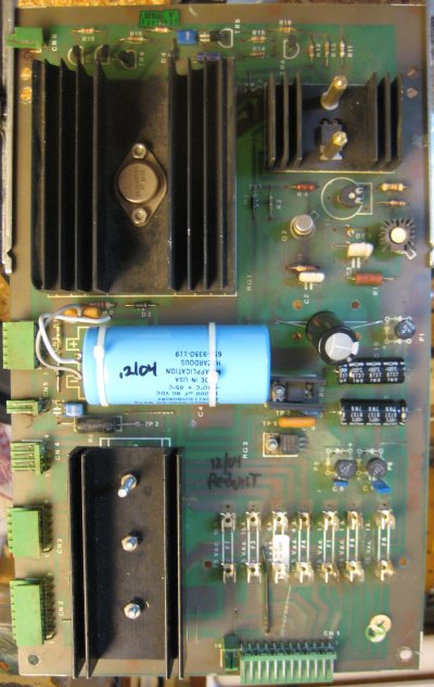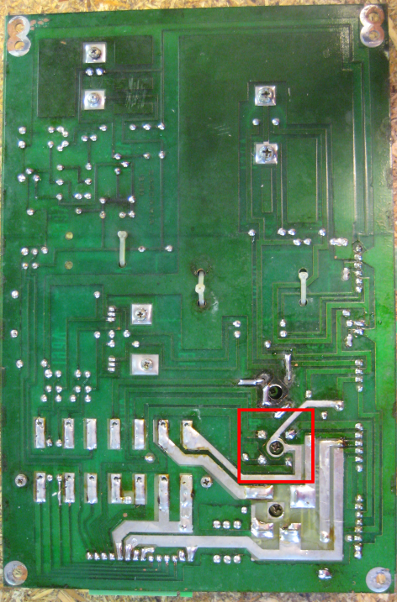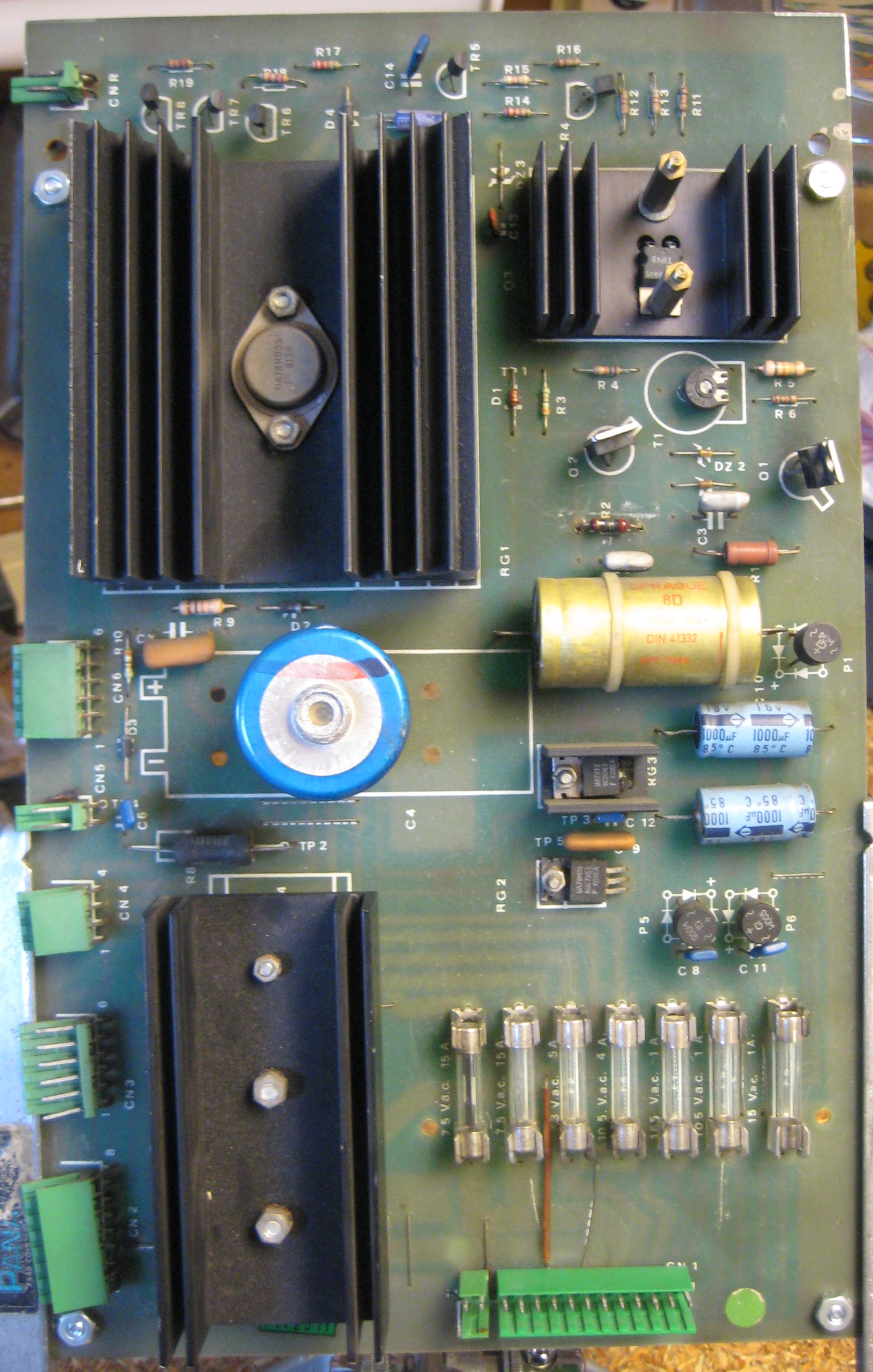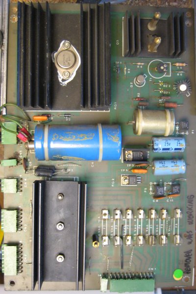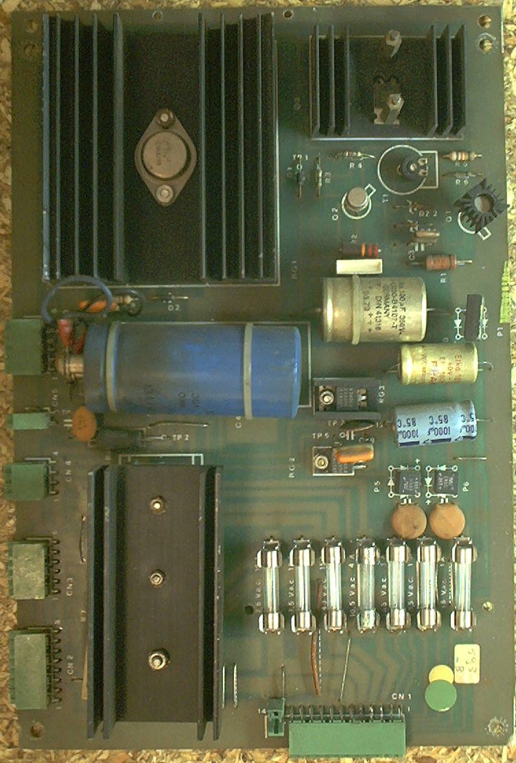 There are three bridge rectifiers mounted under the large heat sink in the middle of the power supply board. If one of them fails, you should replace all three of them while you already have the board out and are working on it. They are lug-type bridges and require a soldering iron that can deliver enough heat to work a large joint. Don't try this with a 15W Radio Shack soldering pencil!