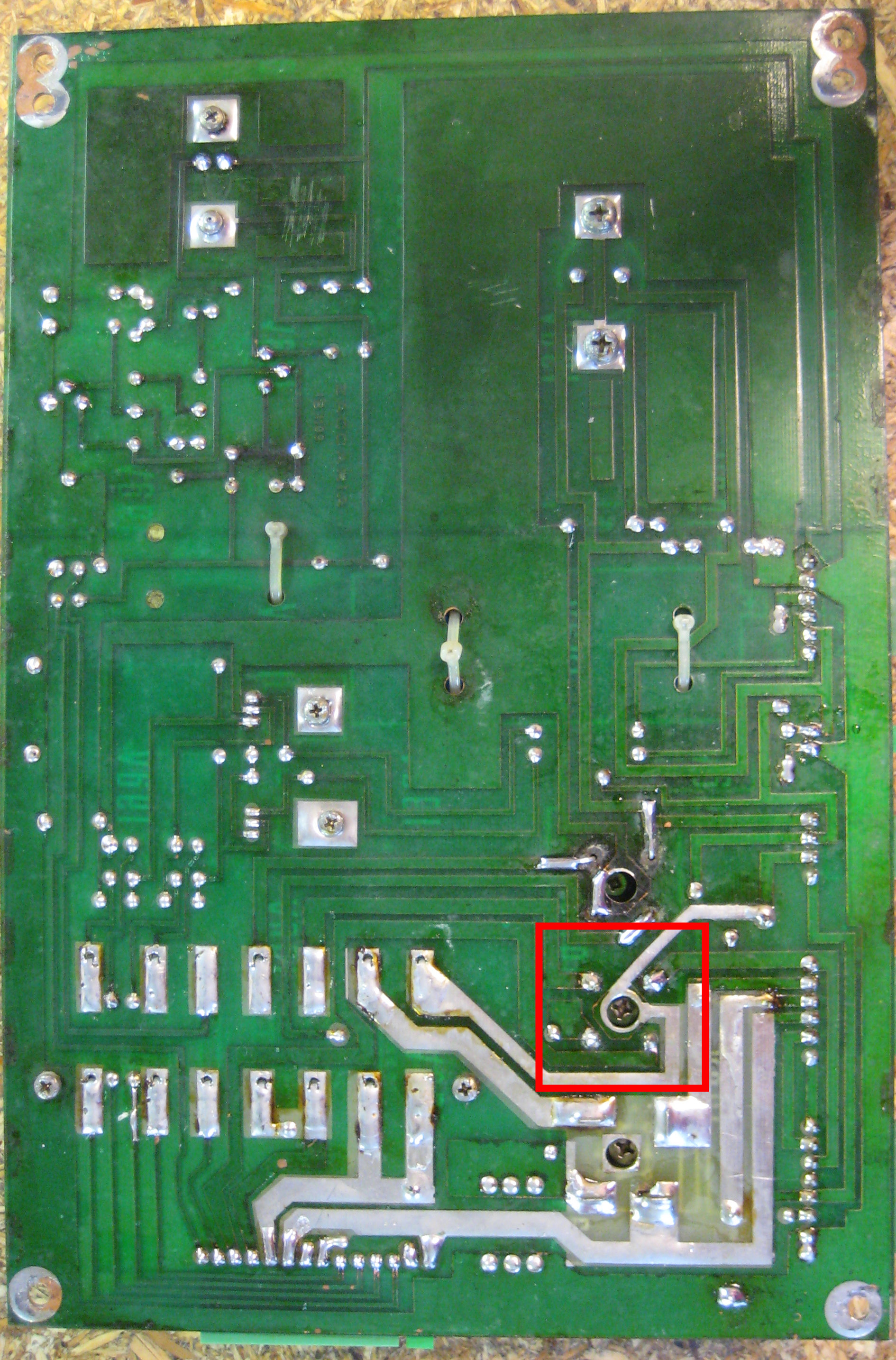 The input connector at the bottom right corner (CN1) of this board can overheat with time, especially on the pins that feed the General Illuminiation (GI) lamps, scorching the housing and building up resistance in the connector pins. On later games, they doubled up the GI input pins, spreading the load over two sets of two pins to reduce this problem. Check here for any signs of overheating and replace the connector and header as necessary.