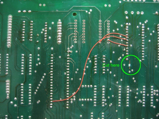Because we are installing RAM in the socket that was intended for ROM3, the CHIP SELECT line for ROM3 must be cut. CHIP SELECT goes, via jumper J13, over to ROM2 in games that use only two ROMs.
