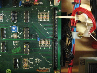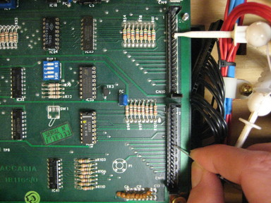 Use the unbanded side of the diode as a probe, and touch it to CN11 pin 10. This should act as if the Test Advance switch on the coin door had been pressed, putting the game in to the Displays Test. Touch CN11 pin 10 again to enter the Switch Matrix Test. |