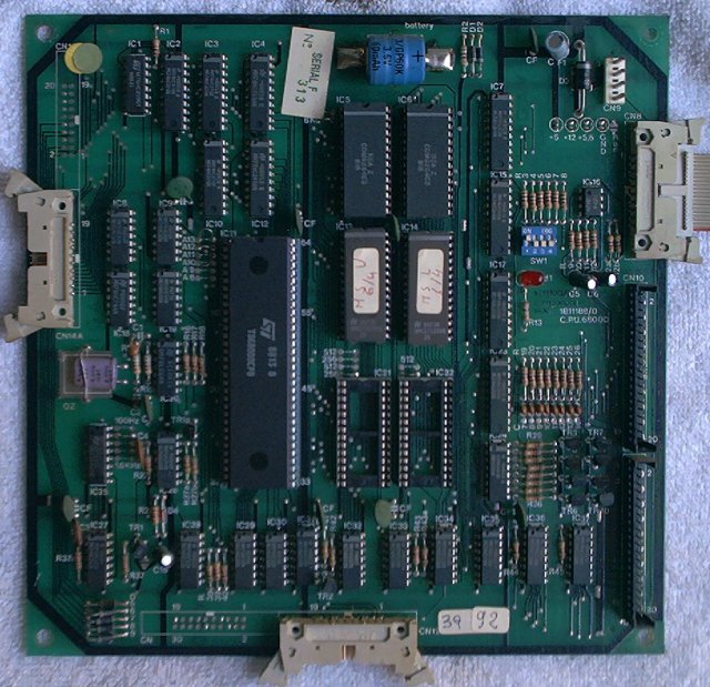 This board houses the CPU chip, game ROMs, game and CMOS RAM with battery backup, and the circuitry for the switch matrix. It has connectors for power, switch matrix send/return lines, and ribbon cables to the driver, sound, and video game board. Unlike the previous Zaccaria games, MrGame uses a Motorola 68000 CPU as the basis for these games.
