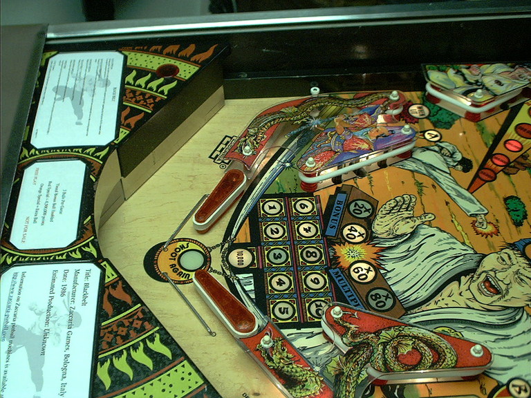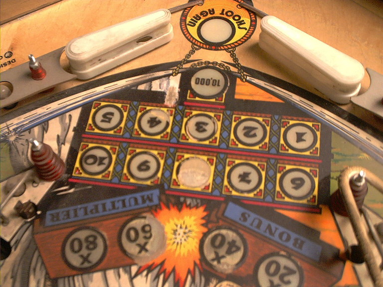 Here is the major trouble spot. Problems, starting from the top of the frame and working down, include the non-original flippers, the flipper drag wear by the 10,000 insert, the chipping of the 4 insert, the complete destruction of the 8 insert surface, and the chipping of the 40X and 60X bonus inserts. There is also some wear around the 3 insert.