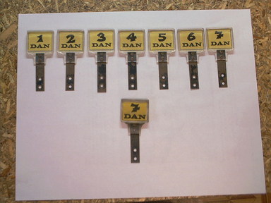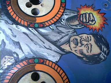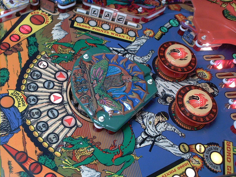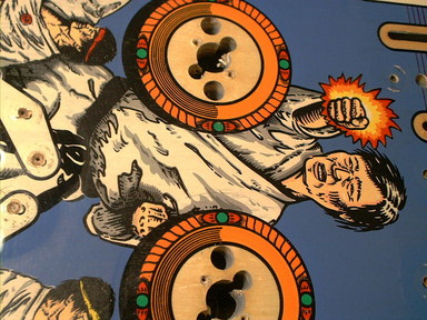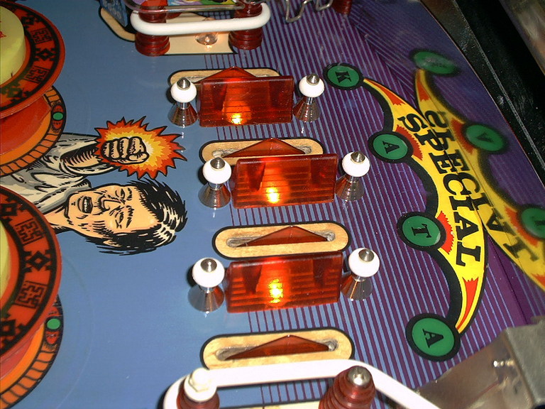 I got some targets images, and between those and pictures from the ones that weren't missing, re-drew the artwork (you can download a copy of the repro sticker artwork from the Artwork Reproductions page) for the target faces. This was printed out on plain paper. Using a Xyron laminator to put a layer of adhesive on the front side, and putting some mylar on the back to protect them, I now had stickers for the artwork. From another spare parts box from a parted out playfield to a World Cup '90, I had eight clear targets that had stickers on them for artwork. I peeled of the World Cup '90 stickers, cleaned up the targets and wet sanded the fronts with 1000 grit paper to smooth them before polishing with Novus, then stuck my own artwork on the back sides. Presto! Nice new targets. I later did the same thing with the two Ippon Red Special targets on the sides.