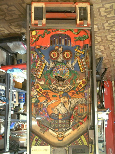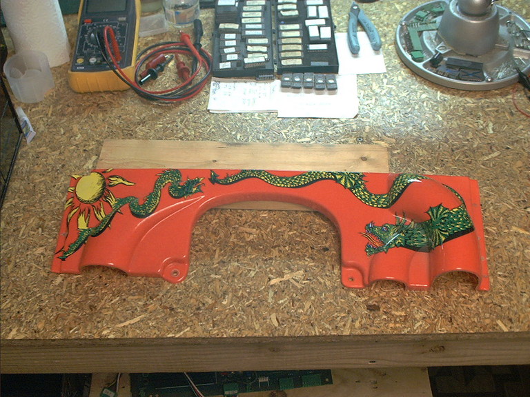 So here is the starting point. My initial quick look was basically right, the cabinet does indeed have some route rash, the coin entry bezel is destroyed, there is a "credit button" where the coin eject button should be, and there is some playfield wear. Oh, and there is that broken plastic over the rototarget. Something will have to be done about that. No legs included, either.