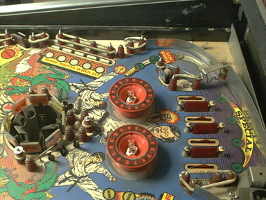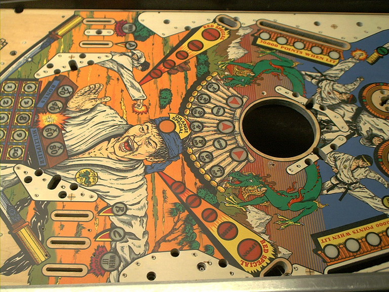 No artwork touchups or clearcoat here, yet, just elbow grease and cleaners. My original plan was just to clean and polish the playfield. I was going to use these pictures, before and after of the same area, to show what a good cleaning and polishing can do. I have been asked many times if my games are clearcoated when people see them, and the answer is (generally) no. Oh, well. This one will be, but the pictures were too good not to use. This area was cleaned first with some Naptha and a rag to remove the grime and grunge, then cleaned with Novus #2 plastic polish and some rags. After that, I rubbed it out with some No. 7 White Polishing Compound, followed up with more Novus #2. Normally, my next step would be to wax it, but since this playfield is going to be clearcoated, I didn't do that.