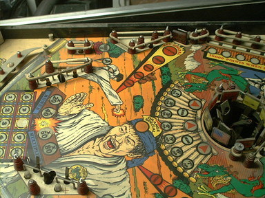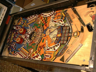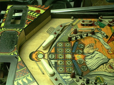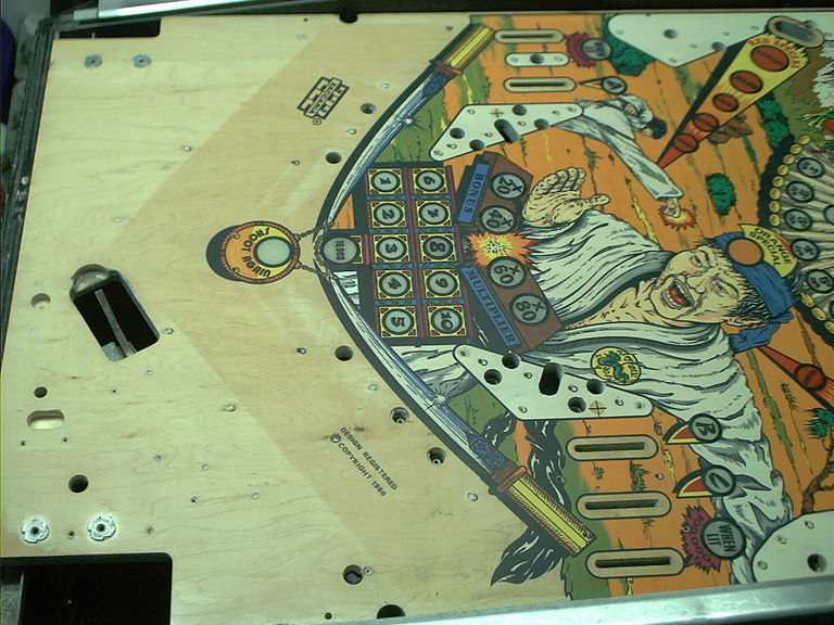 So, the plans changed. I'll do the artwork touchups, then clearcoat the whole playfield to seal in and protect the surface from future damage. The only remaining parts, the wire ball guides, were removed, and restoration got underway.