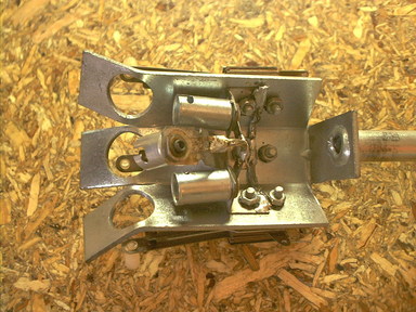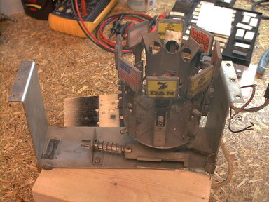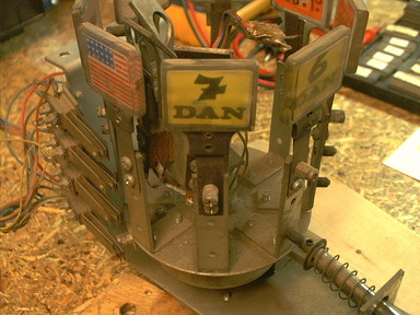 The rototarget assembly had a few problems, including missing the lamp sockets that are supposed to illuminate it, and the broken return spring. And some of the targets had been swapped in from a Devil Riders, probably to replace broken ones, and several of the others were working on breaking off as well. Some spelunking in the local hardware store turned up a spring of approximately the right strength, and I pulled some lamp sockets out of the spare parts box from a parted out playfield. Those were the easy parts to take care of.