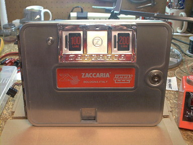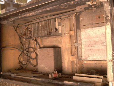 Inside was as dirty as everywhere else. After a good cleaning, and with a new power cord installed, it looks much better. I also replaced the flipper button switches, and fabricated a little metal cover to hide the hole from somebody's installation of a "credit" button on the bottom side.
