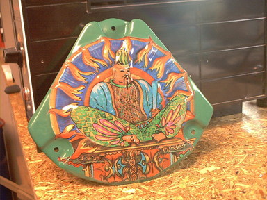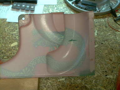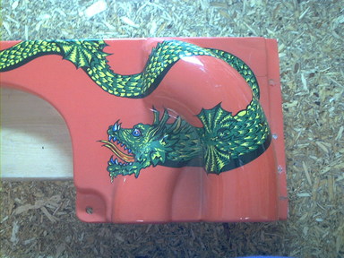 This plastic had the mounting ear broken off on one side, the mounting ear cracked on the other side, and a chunk missing from the back right corner. I repaired the missing area by backing it with a chunk of PETG plastic attached with Liquid Nails for Small Projects glue, then using Squadron Green plastic putty to fill in the area. Once the putty was hardened and hand sanded to shape, I airbrushed the repaired area red to blend it in with the plastic. I also touched up a scratched area (you can see it on the shot showing the inside) in the dragon artwork.